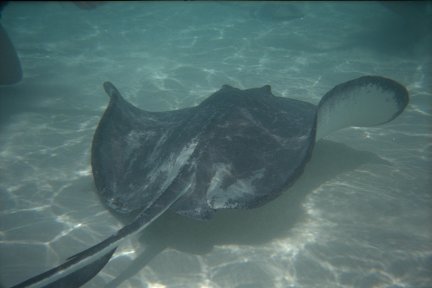 After an hour on the beach, we headed for the highlight of the trip. We stopped over a sandbar with waist-high water and were immediately surrounded by about a dozen stingrays, ranging in size from a baby about as big as a catcher's mitt to one the captain called Darth Vader, whose wing-like fins spanned nearly 5 feet. The slippery, slimy creatues brushed up against us looking for food. The captain grabbed one for each of us to hold and gave us food for them. This caused the rays to swim all over us. It was great fun -- everyone was laughing and giggling and squealing. Don't miss a chance to frolic with the stingrays.